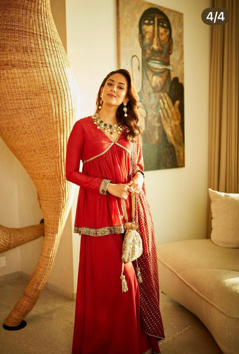 This exquisite cotton silk kurta, with gorgeous hand embroidered yoke, paired with bias sharara cotton silk pants and a beige embellished ajrakh dupatta creates a subtle yet stylish ensemble.
